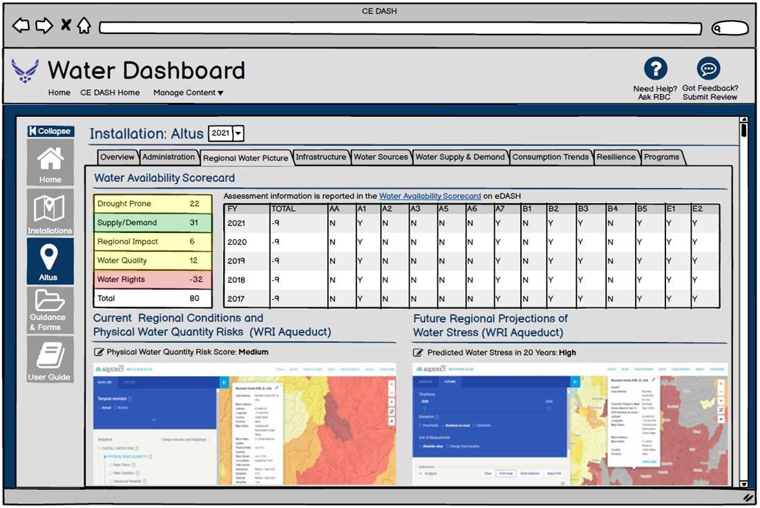 The water resources management program developed an Installation Water Dashboard to serve as a single interactive data repository. The Installation Water Dashboard is hosted on CE DASH and compiles all relevant water data in a single place to support installation resilience planning.